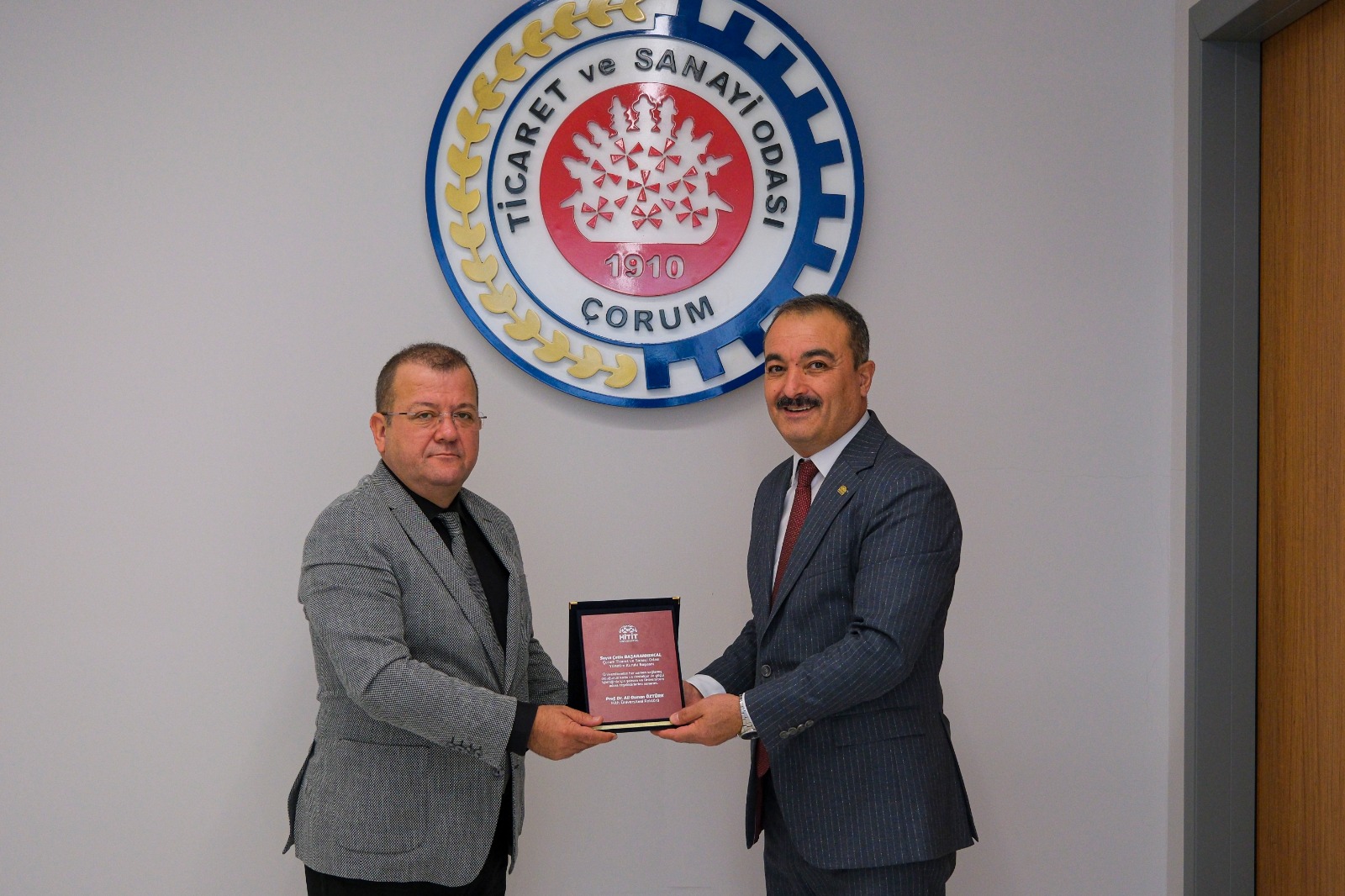 Odamıza Ziyaret - ( 26 Eylül 2025) Hitit Üniversitesi Rektörü Prof. Dr. Ali Osman Öztürk ve Rektör Yardımcıları Prof. Dr. Nurcan Baykam, Prof. Dr. Halil İbrahim Şimşek, Prof. Dr. Eşref Savaş Başçı, Yönetim Kurulu Başkanımız Çetin Başaranhıncal’ı ve Yönetim Kurulu Üyelerimizi ziyaret ettiler. Gerçekleşen ziyarette Hitit Üniversitesi Rektörü Prof. Dr. Ali Osman Öztürk, Yönetim Kurulu Başkanımız Çetin Başaranhıncal’a ve Yönetim Kurulu Üyelerimize, Odamızın Hitit Üniversitesi’ne sağlamış olduğu katkı ve destekler ile güçlü iş birliklerinden dolayı teşekkür plaketi ve teşekkür belgesi takdiminde bulundu.