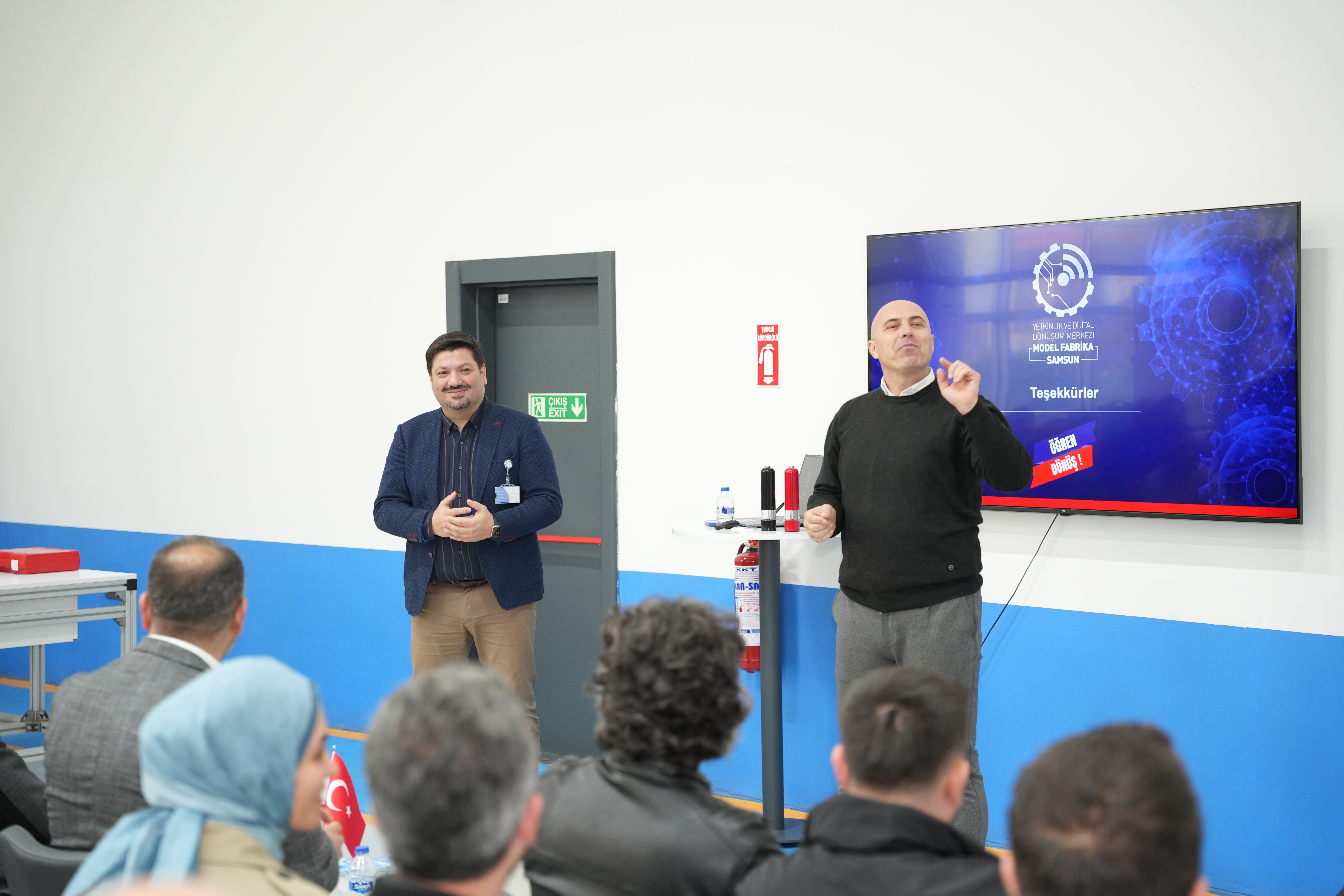 Odamız ve KOSGEB iş birliğiyle, Samsun Organize Sanayi Bölgesi’nde faaliyet gösteren Model Fabrika’ya yapılan teknik gezi - ( 11 Kasım 2025) Odamız ve KOSGEB iş birliğiyle, Samsun Organize Sanayi Bölgesi’nde faaliyet gösteren Model Fabrika’ya bir teknik gezi düzenlendi. Yalın üretim, dijital dönüşüm ve yeşil dönüşüm alanlarında hizmet veren, verimliliği artırmak ve israfı önlemek amacıyla kurulan Model Fabrika’ya gerçekleştirilen ziyarete, Çorum’dan 25 firmadan 40 kişi katılım sağladı. Katılımcılara, Model Fabrika Direktörü Onur Berberoğlu tarafından fabrikanın çalışma sistemi, amaçları ve faaliyetleri hakkında bir sunum yapılarak detaylı bilgiler aktarıldı. Teknik gezi, katılımcıların sorularının yanıtlanması ve bilgi alışverişinin ardından sona erdi.