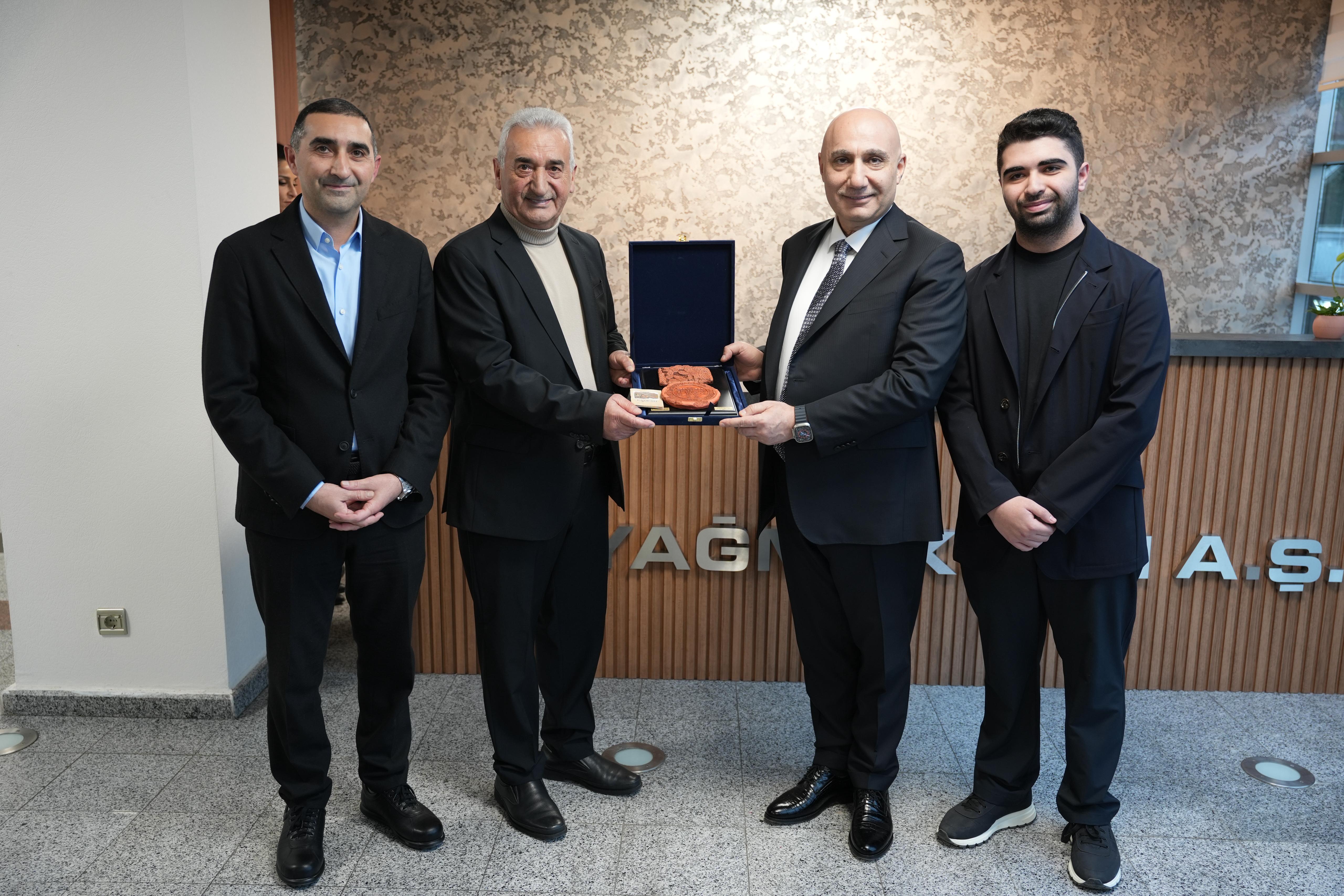 Ziyaret anısına firma sahipleri Mustafa Yağlı ile Fatih Yağlı ve Mustafa Kerem Yağlı, Halkbank Genel Müdürü Osman Arslan’a hediye takdim ettiler.
