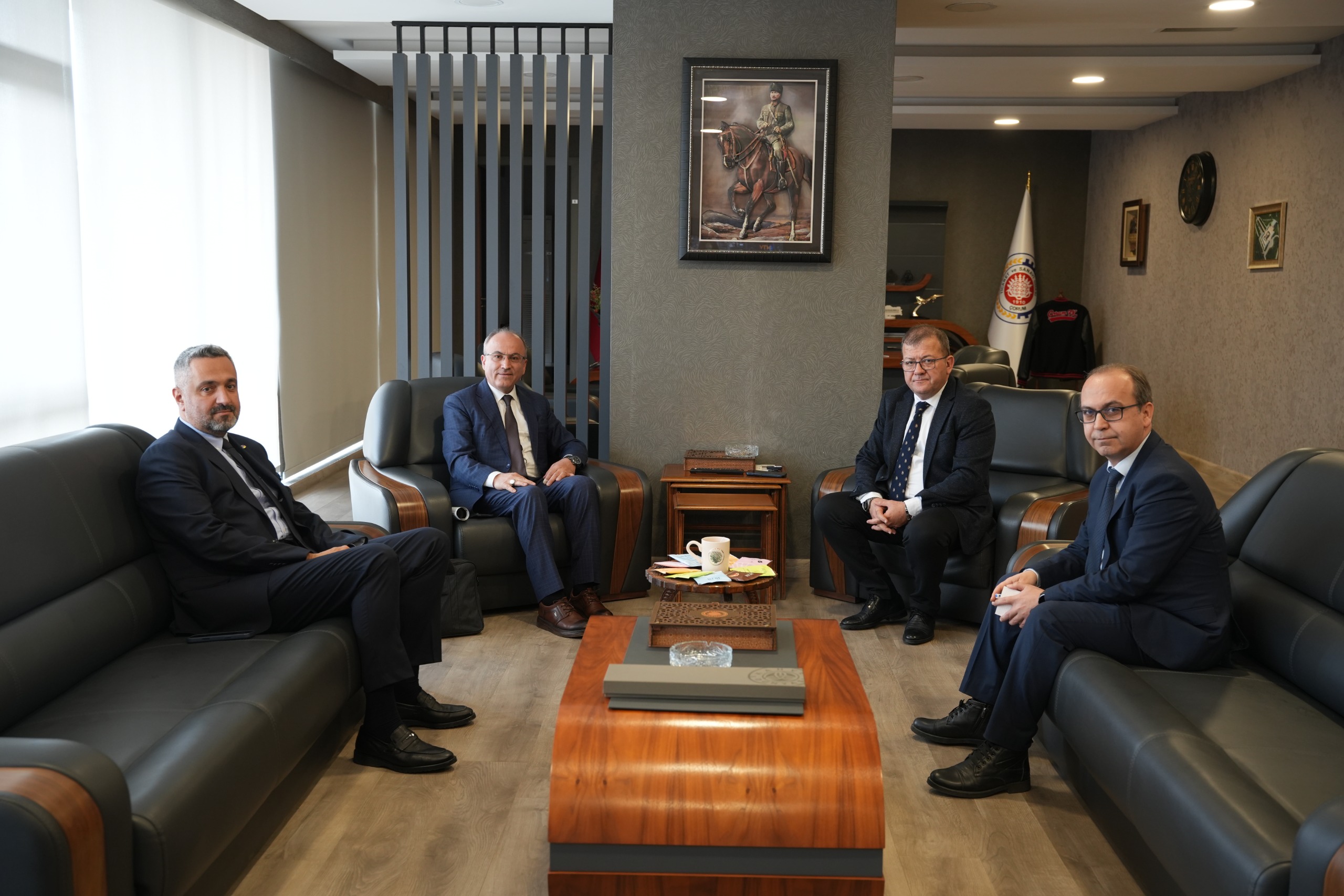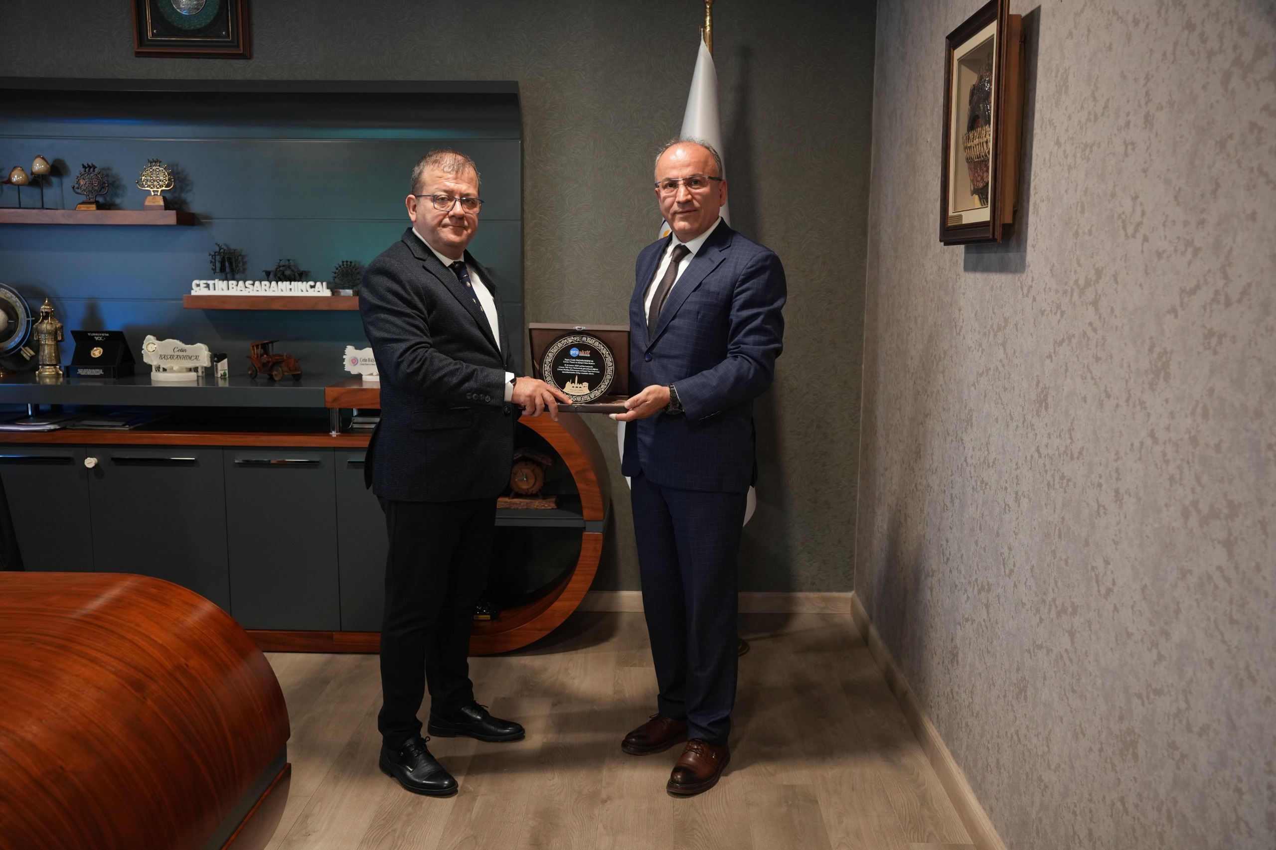Ziyaret kapsamında Hüseyin Şahin, 13-16 Kasım 2025 tarihleri arasında Çorum TSO Fuar Merkezi’nde gerçekleştirilen Çorum Mobilya, Dekorasyon ve İnşaat Yapı Fuarı’na verilen desteklerden dolayı Başkanımız Çetin Başaranhıncal’a plaket takdim etti.
